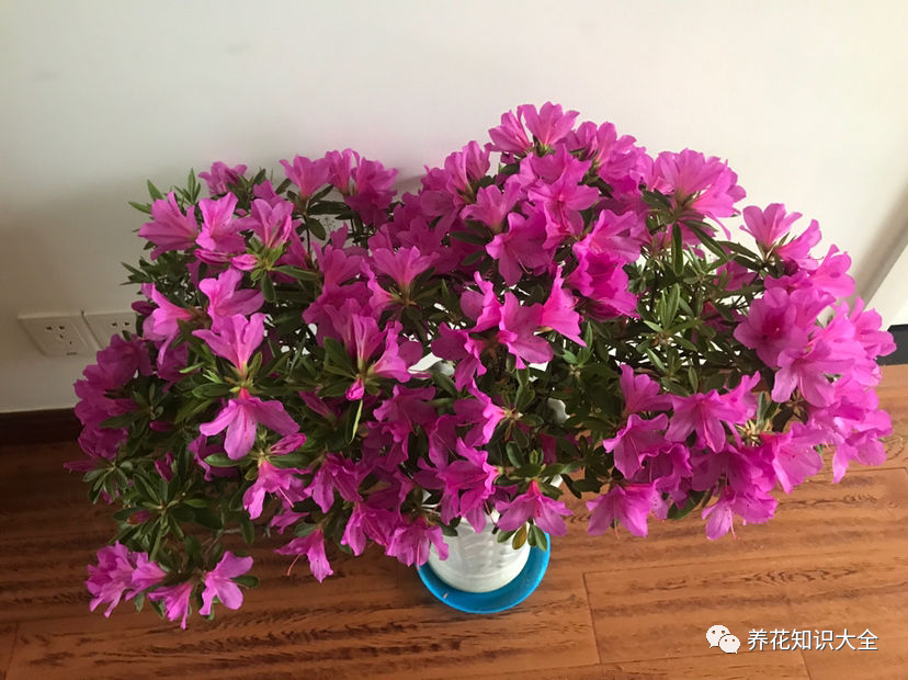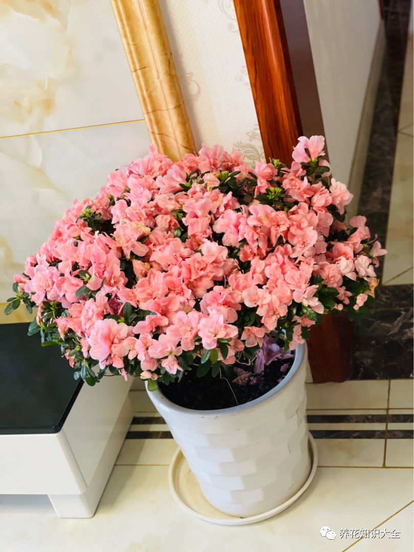 花花还要嘱咐一下大家,如果想要杜鹃花开花开到爆,就要给它放到有散射光的地方,杜鹃花只有在光照不好的条件下开花才是最好的,所以杜鹃花打了花苞之后,可以把它放在家里不是特别亮的地方去养它,比如说客厅的位置或者是北阳台,有散射光,光照还不是很强。