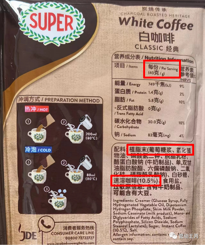 看配料表,纯咖啡粉只占10.5%,每袋只有可怜的4克,而植脂末是含量最多的!