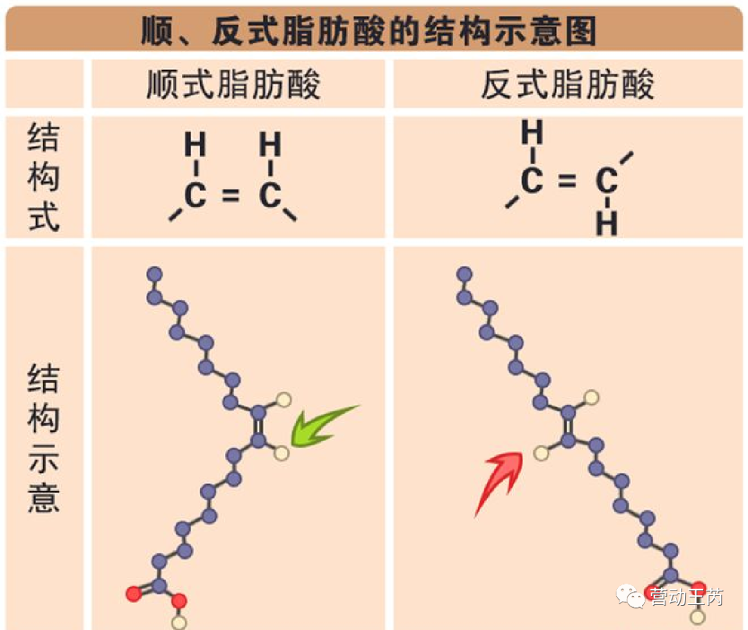 从分子结构图中可以看出,顺式脂肪酸两个氢分子在同一侧,而反式脂肪酸两个氢分子则在对侧。不理解没关系,知道反式脂肪酸不好就行了。
