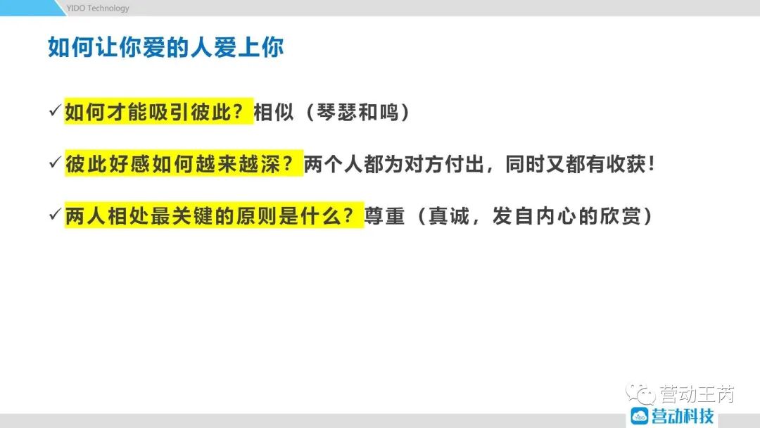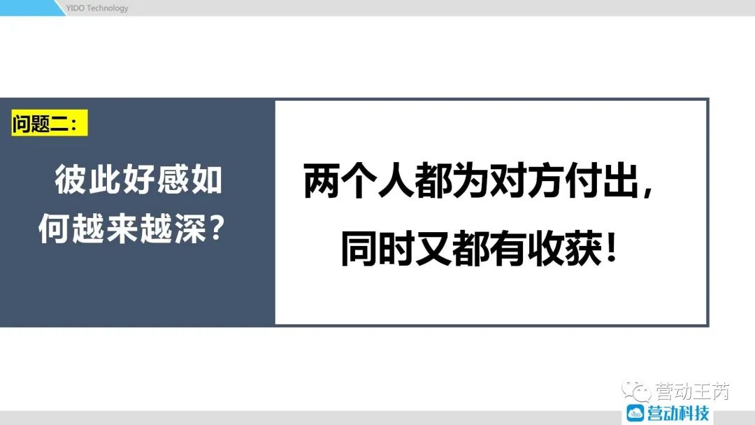问题二:彼此好感如何越来越深?答案是“两个人都为对方付出,同时又都有收获!”。