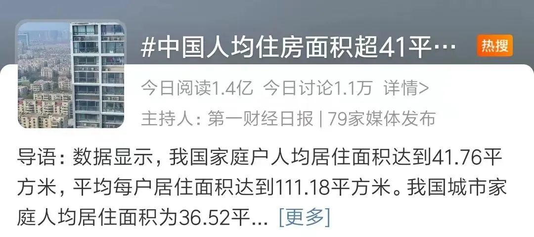 另一条热搜,是热榜上的一个词条“中国人均住房面积超41平方米”。