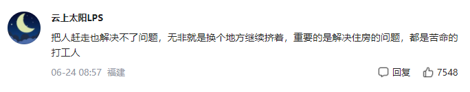 “把人赶走也解决不了问题,无非就是换个地方继续挤着,重要的是解决住房问题,都是苦命的打工人。”