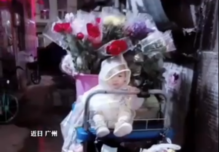 单亲妈妈雨天带着女儿出摊卖花,漂亮的宝宝穿着雨衣坐在小推车后面。