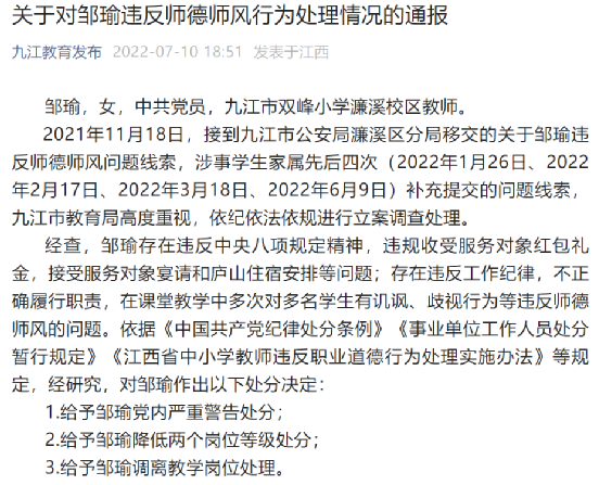7月10日,当地教育局发布公告说,教师邹某收红包、接受宴请、讥讽歧视学生,违反师德师风,给她党内严重警告处分,并把她调离教学岗,降低两个岗位等级。