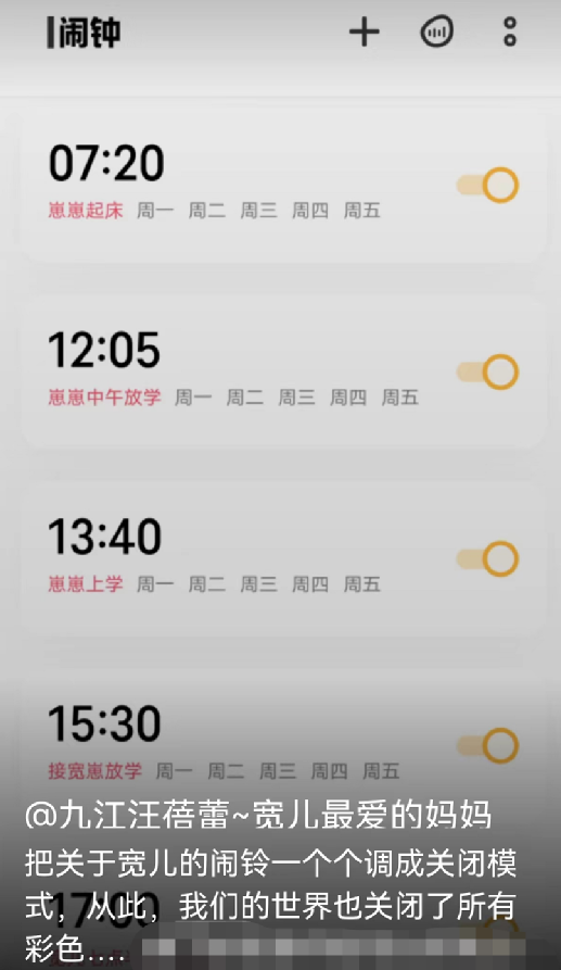 她说,孩子走后,她一个个关闭关于孩子的闹钟,“我们的世界也关闭了色彩”。