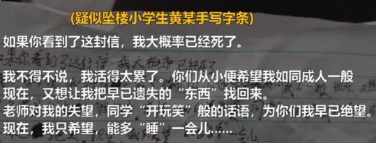之前网上有一个疑似小学生的遗书,里面说:“如果你看到这封信,我大概率已经死了,我活得太累了……”