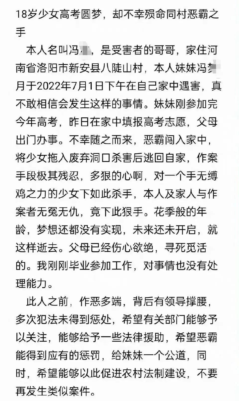女生冯某月遇害后,她刚大学毕业参加工作的哥哥,怀着悲痛欲绝的心情,写下这样一封求助信: