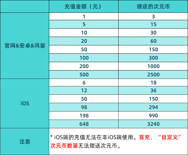 2、非首充赠币只有使用「固定档位」充值才会有赠次元币,安卓、官网、鸿蒙“自定义次元币数量”充值并没有次元币赠送;