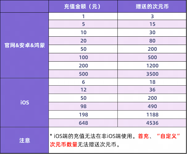 2、非首充赠币只有使用「固定档位」充值才会有赠次元币,安卓、官网、鸿蒙“自定义次元币数量”充值并没有次元币赠送;