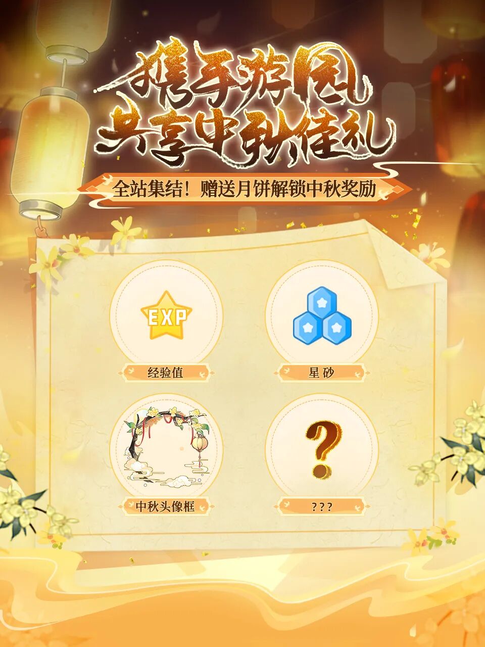 全站赠送“月饼”数达标后,可解锁经验值、星砂、中秋限定头像框等奖励!还有神秘奖励等待揭晓!