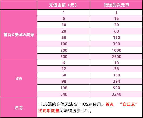 2、非首充赠币只有使用「固定档位」充值才会有赠次元币,安卓、官网、鸿蒙“自定义次元币数量”充值并没有次元币赠送;