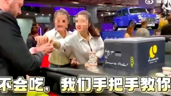 当时,宝马展台,有两名工作人员正在免费分发冰激淋。