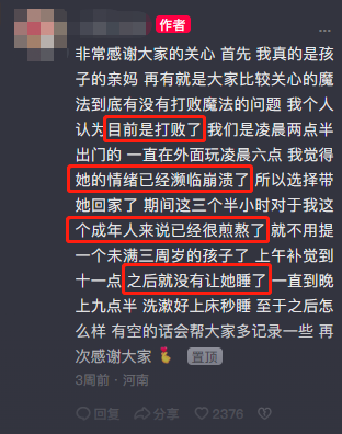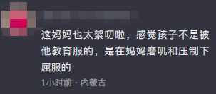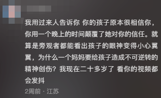 除此之外,妈妈一连串的“你看这外面有小朋友吗”“为什么你不睡觉呀宝宝”“妈妈陪你出来是为了保护你的安全”“你不要找事儿”——
