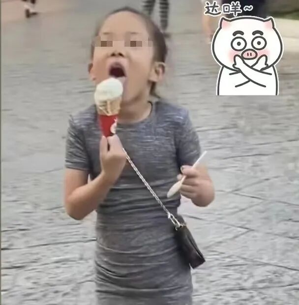 值得令人注意的是,因为小女孩还拿着一个冰激凌在吃,
