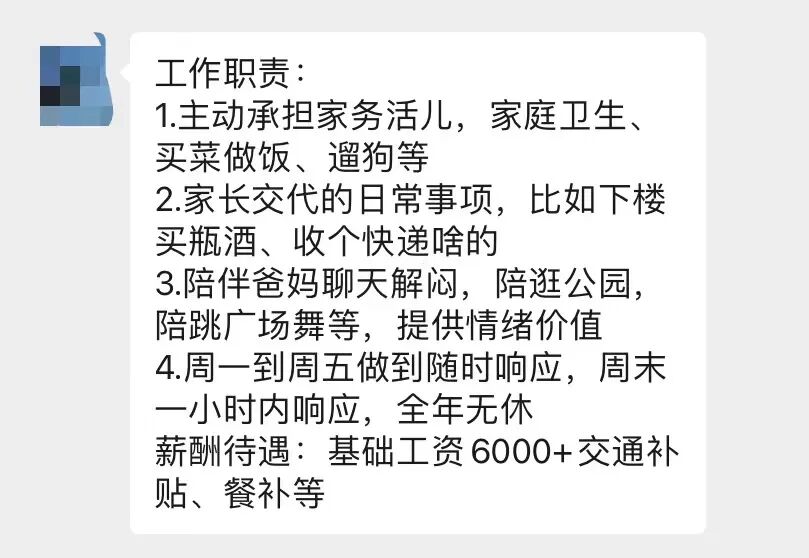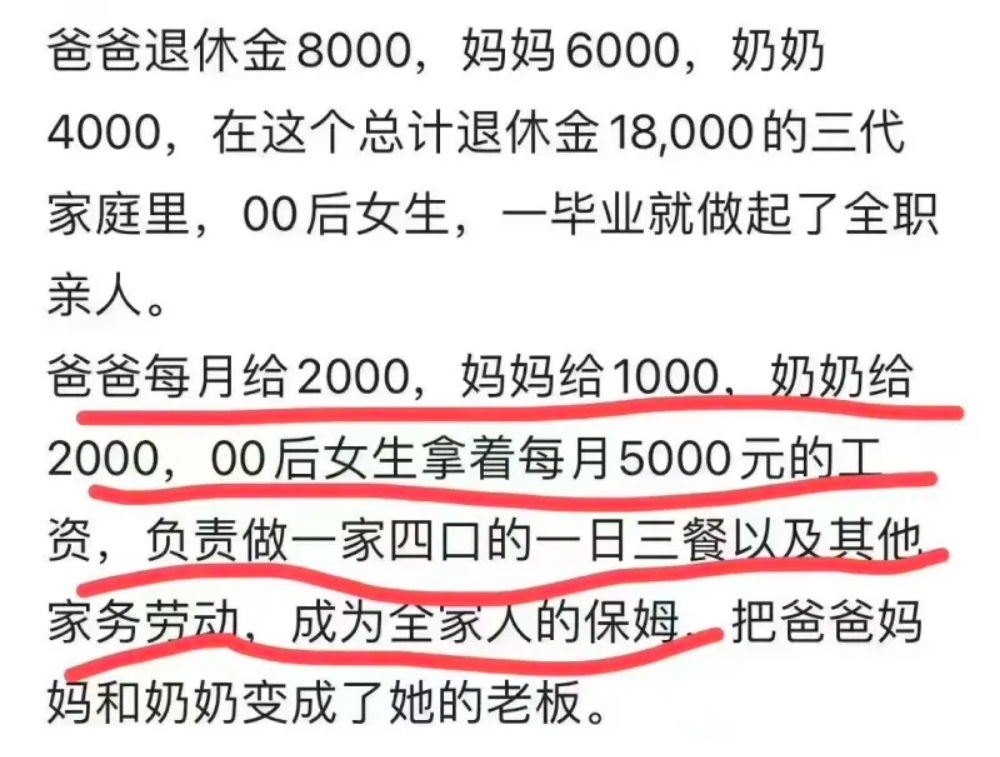 那年轻人当然那会去对比考虑,既然外面发的工资还不够父母请保姆的,不如跳过中间商,直接回家当保姆。