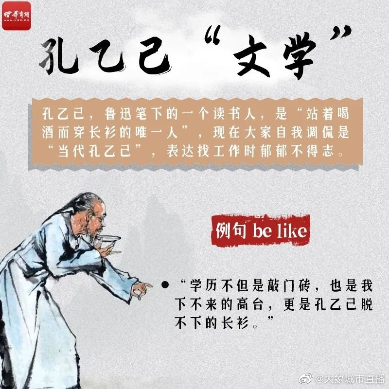 抑郁不得志,自嘲孔乙己。