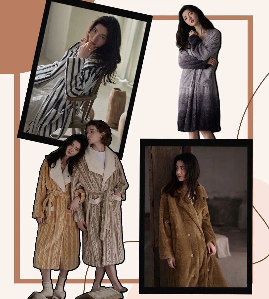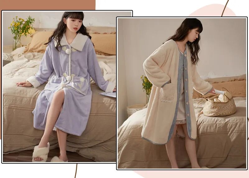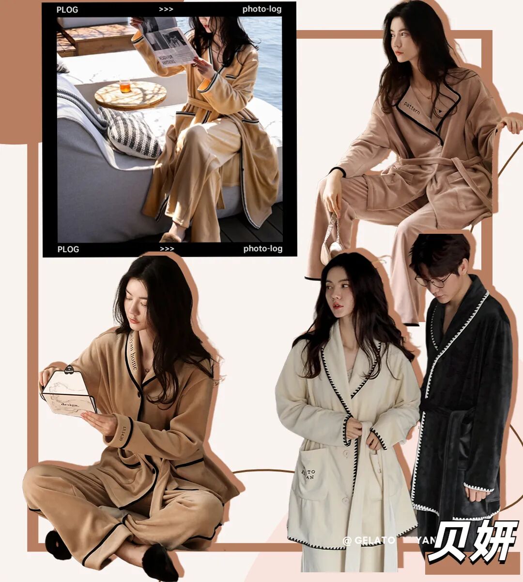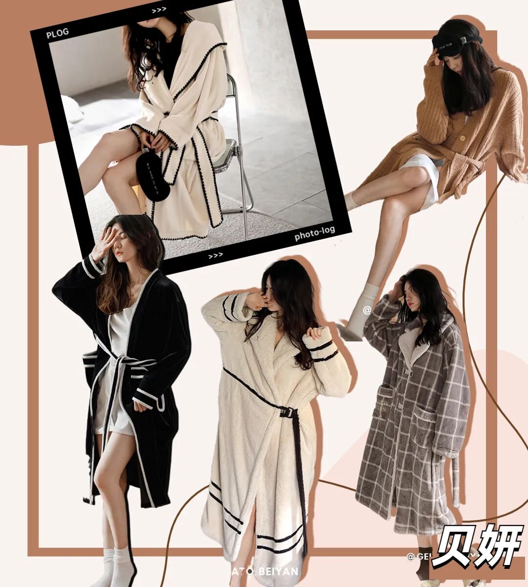 珊瑚绒睡袍看上去就很温暖,包边设计精致度up!