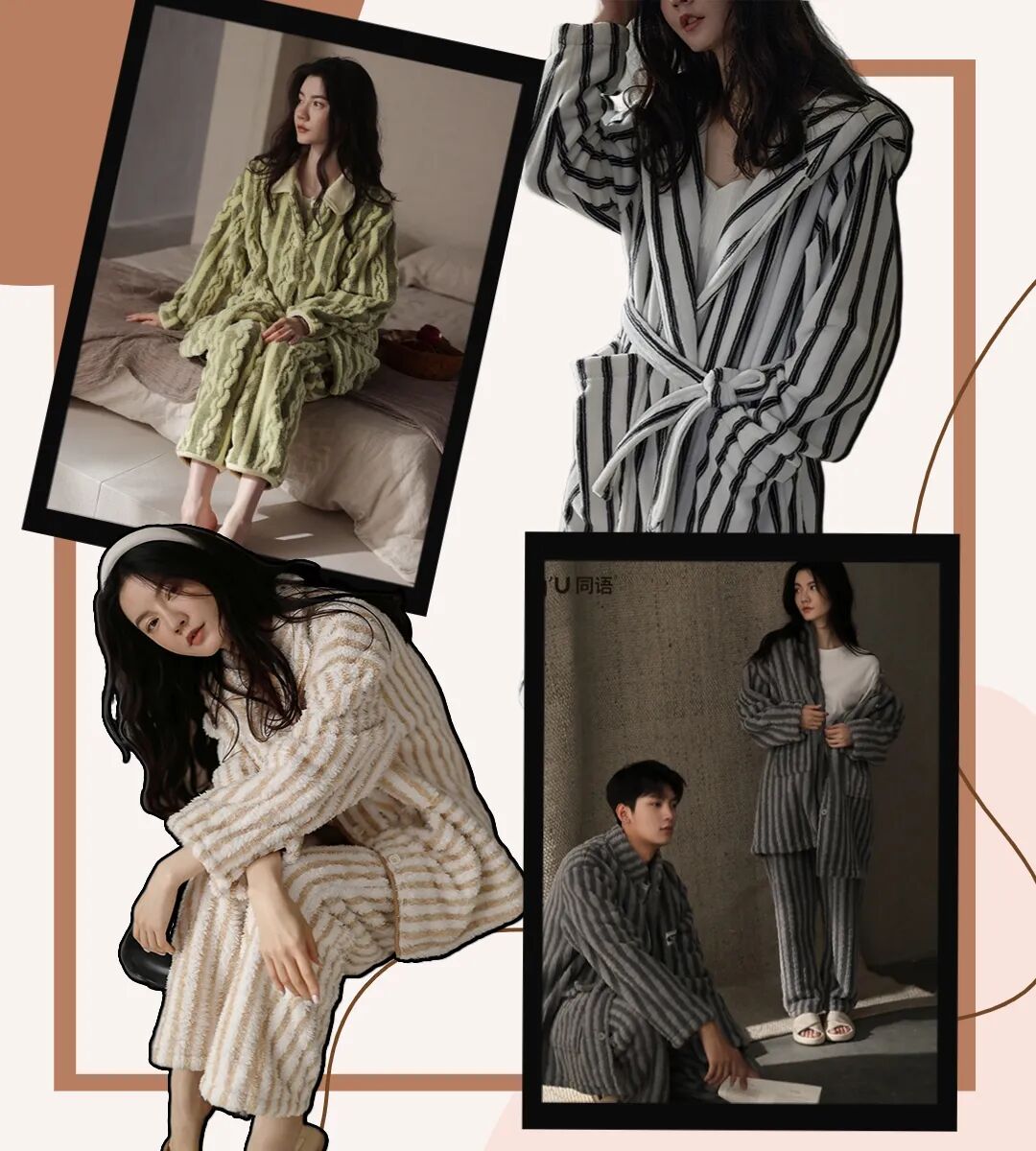还有潮人必备的睡袍,款式和设计也是相当多,纯色的、条纹的应有尽有~