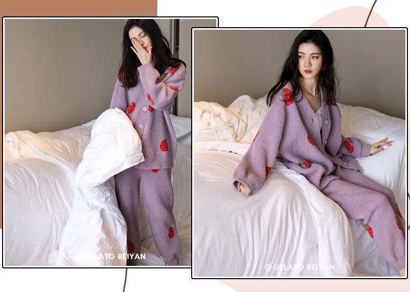 紫色小草莓甜美又温柔,珊瑚绒材质也很保暖,真心难以拒绝这份温暖~