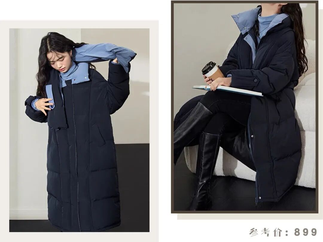 最后再搭配一件长款的羽绒服,中长款设计保暖还显瘦!蓝色的内里和打底衫完美呼应,可拆卸的围脖也非常加分,时髦感瞬间拉满~