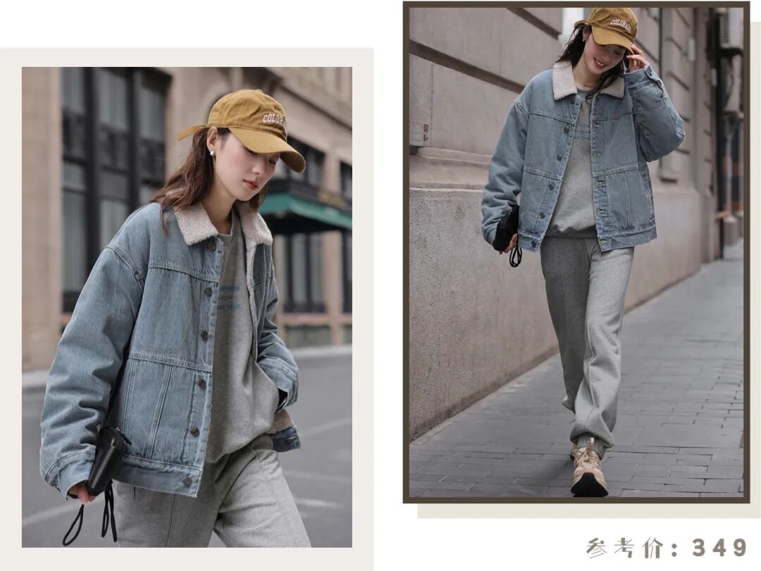 对于不是很冷的南方地区,外面来一件加绒的牛仔夹克就够了,内里羊羔毛设计非常保暖,这一整套下来,休闲的时髦感一整个拉满~