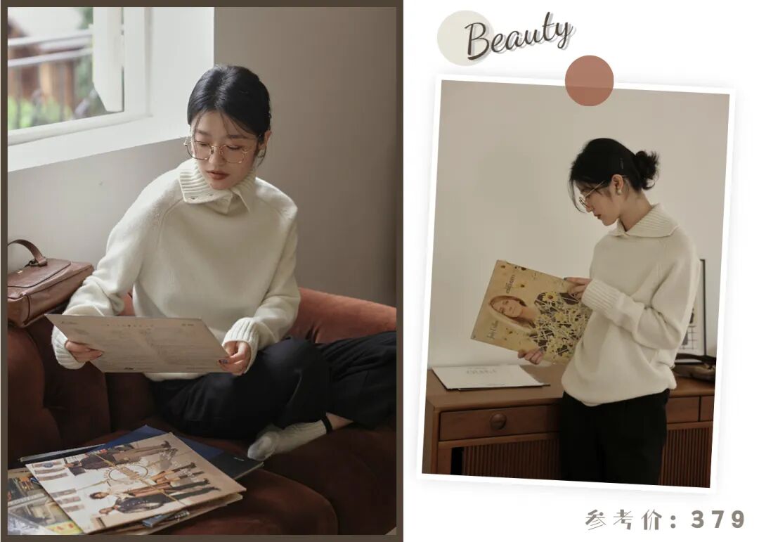 内搭先来一件羊毛翻领的针织上衣吧,多种领口设计也太贴心了,既可以当做高领,也可以当做方领。下摆的窄卷边设计,轻松又随意~