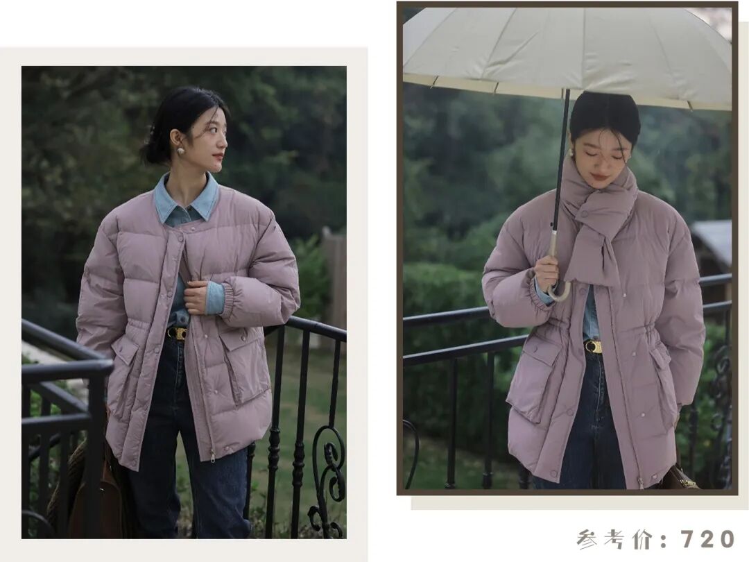 最后选择一件浅紫色的外套,清新淡雅的奶芋紫,日常又好看,圆领设计简约大气,可脱卸的羽绒围脖,保暖又时髦,谁能不爱?