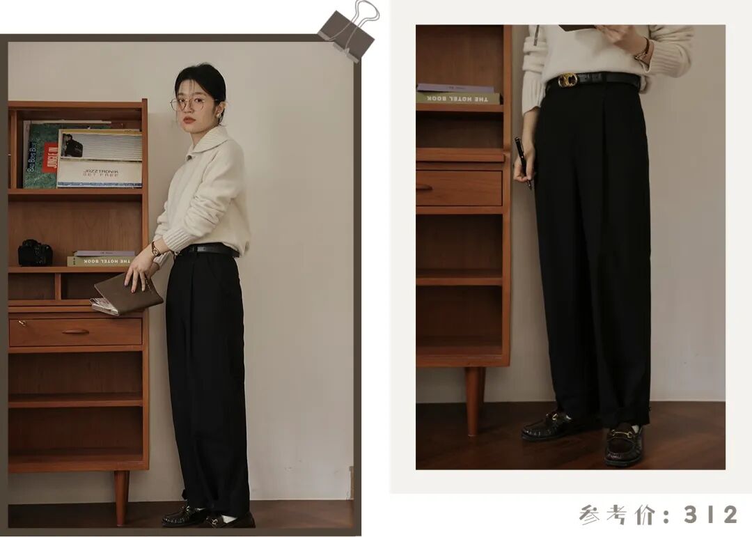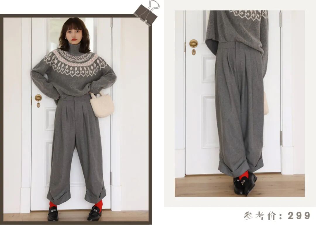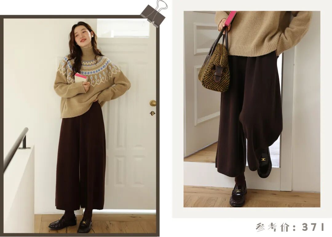 如果你pick的是浅卡其的毛衣,那就要注意一下暖色调的使用,搭配一条红棕色的羊毛阔腿裤,再合适不过了,遮肉满分,上身利落不拖沓!