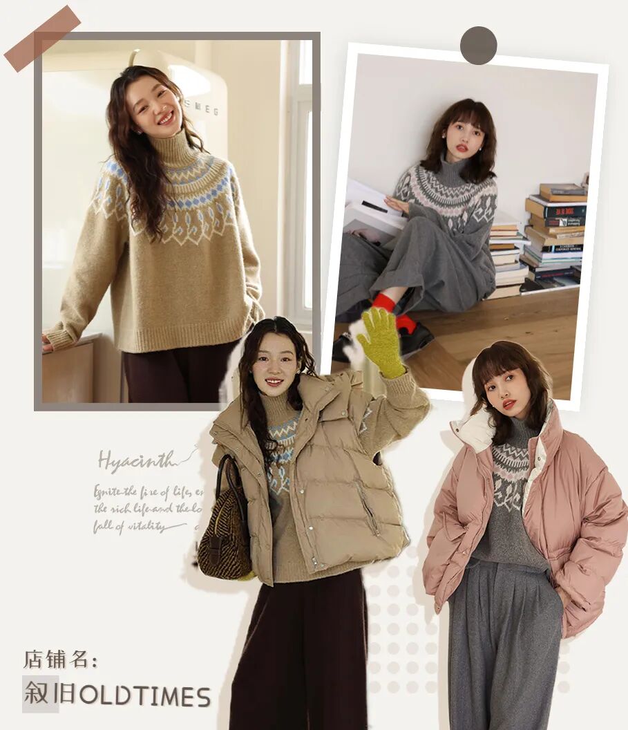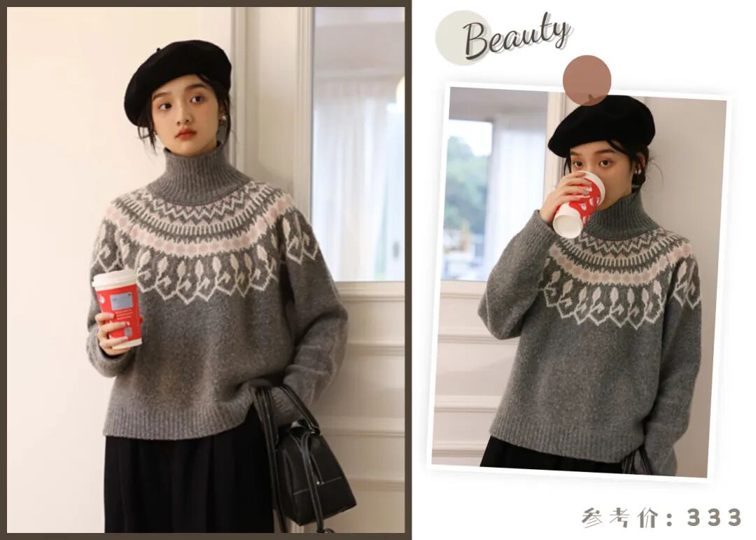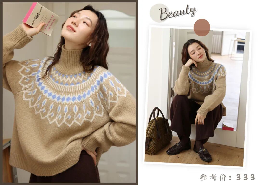 先选择一件复古高领毛衣当作打底吧,撞色提花图案,自带复古滤镜,小众不撞款,满满的秋冬氛围感。