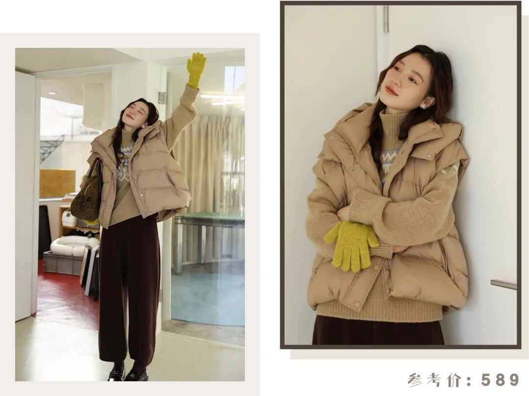 外面再穿一件浅卡其的羽绒背心,这套衣服的色彩搭配也太nice了吧,非常和谐,保暖又时髦,是专属于秋冬的颜色~
