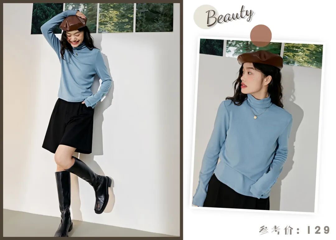 想把视觉重点放在上半身,那上衣的色彩就要下点功夫了,这件浅蓝色的打底衫就很不错,给人一种优雅知性的美感。