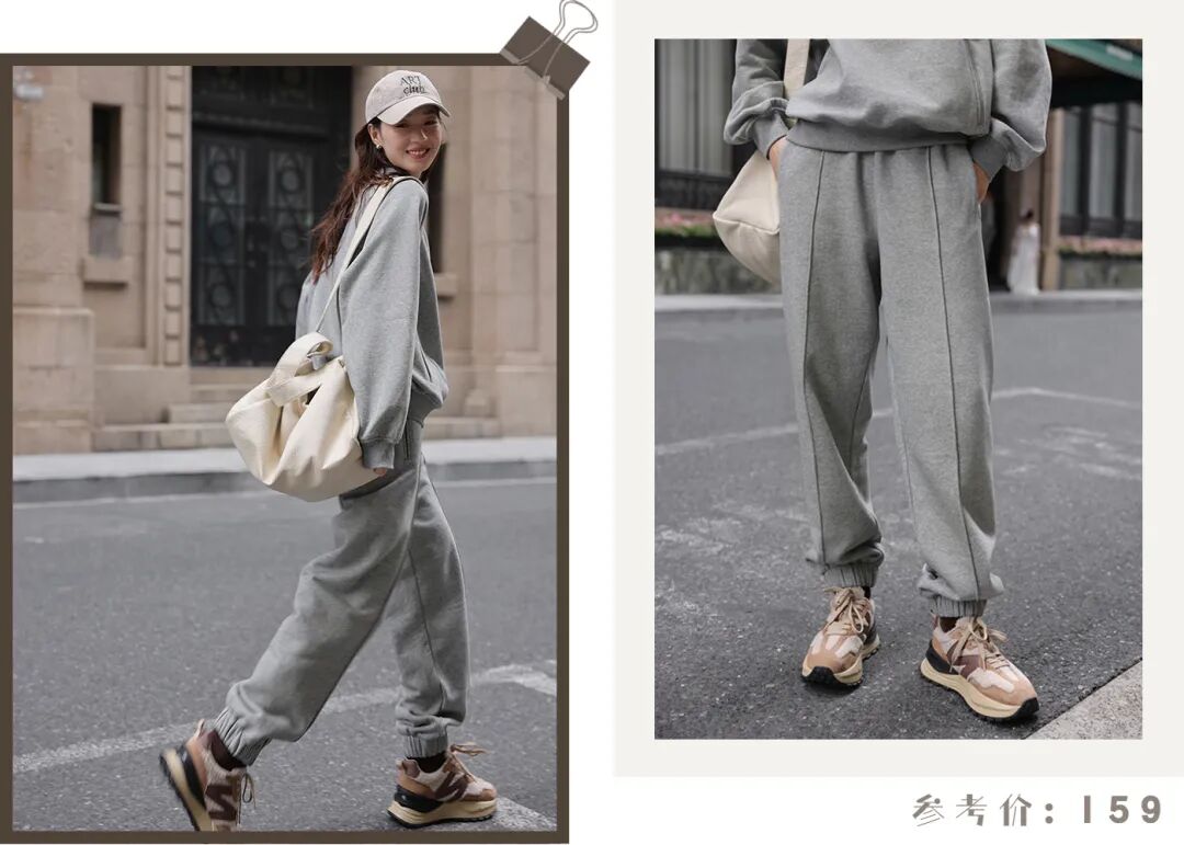 成套灰色休闲裤也安排上!裤脚处的松紧设计,利落不拖沓。不得不说,套装穿起来就是方便,真懒人福音!