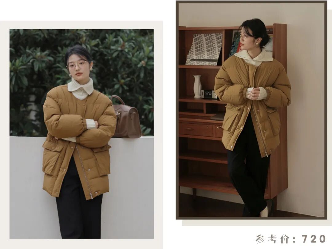 外面再套上一件焦糖色的羽绒服,遮臀的长度,既保证了保暖性,也不会显得拖沓,小个子女生也可以轻松驾驭。