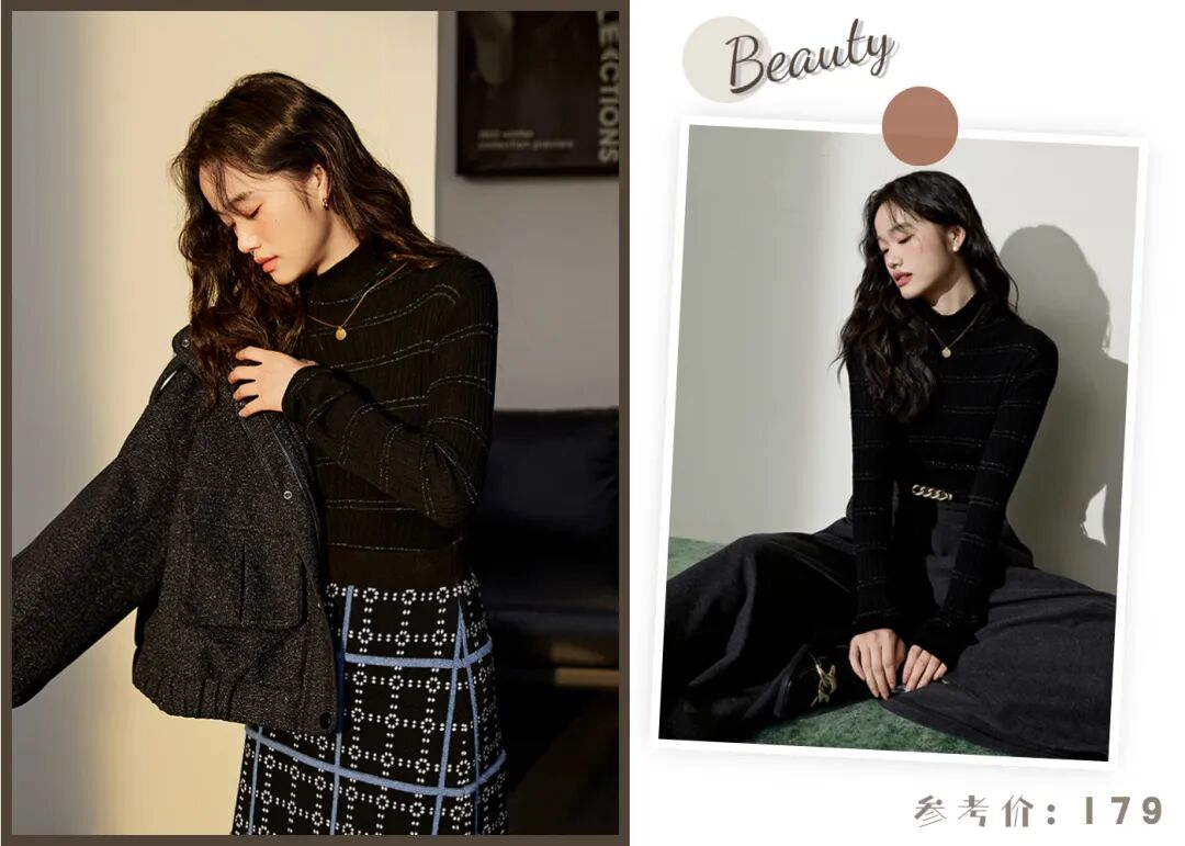 一件肌理感的打底衫先安排上,微闪金丝线拼接的工艺,自带bulingbuling的浪漫气息,时髦有质感。