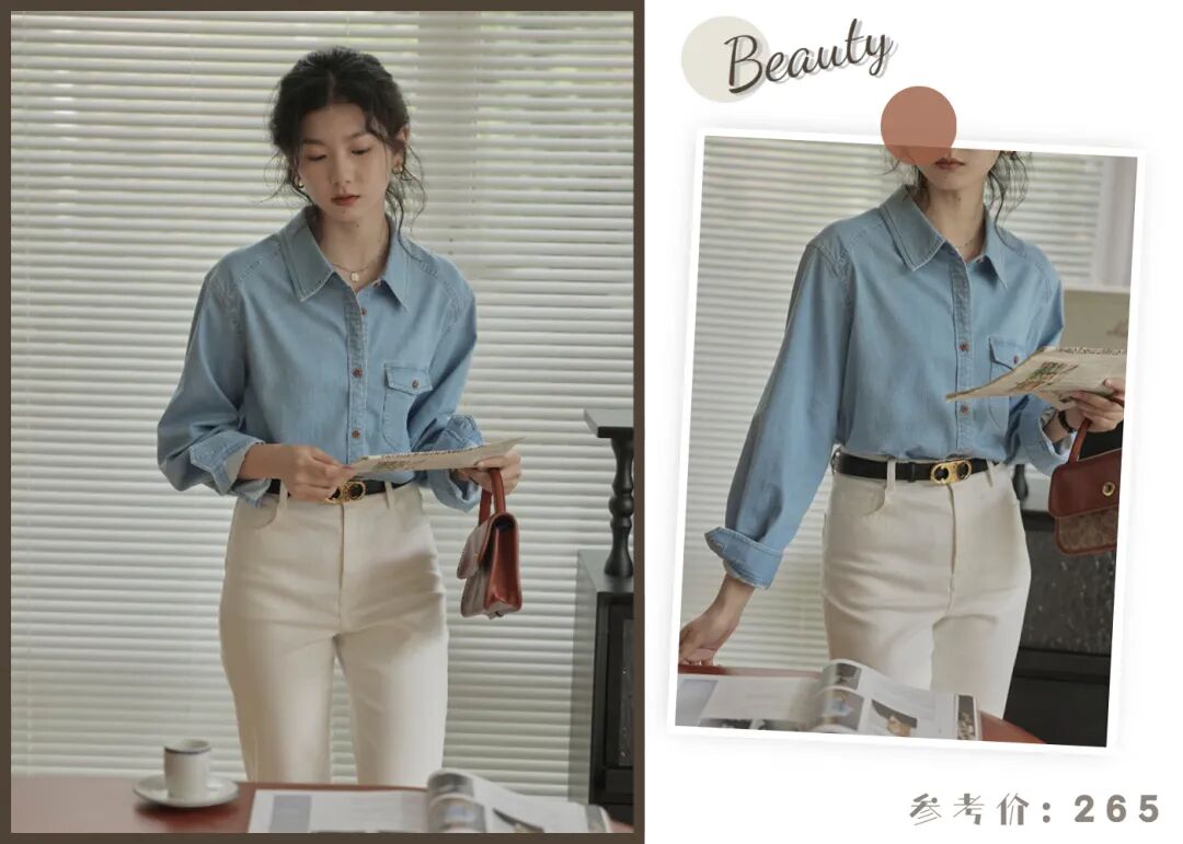 不喜欢穿毛衣的姐妹,可以把内搭换成衬衫,这件浅蓝的牛仔衬衫就很不错,微松的直筒版型,显瘦不挑人,小宽肩设计松弛有度,对身材的包容性很强~