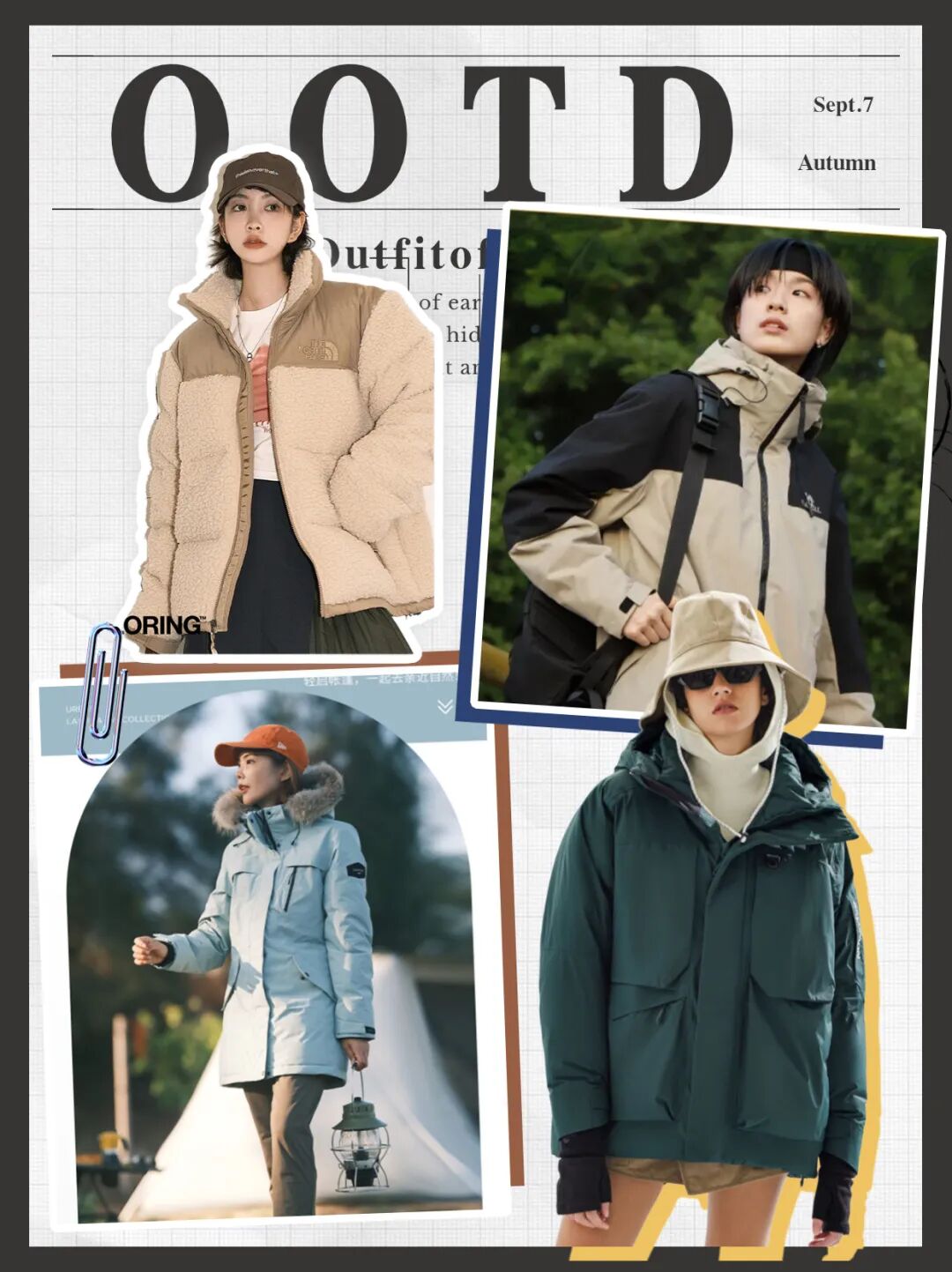 户外羽绒服更讲究防风防雨和御寒的效果,所以款式以冲锋衣居多,在外形选择上会比较单一。但是御寒效果绝对没的说。