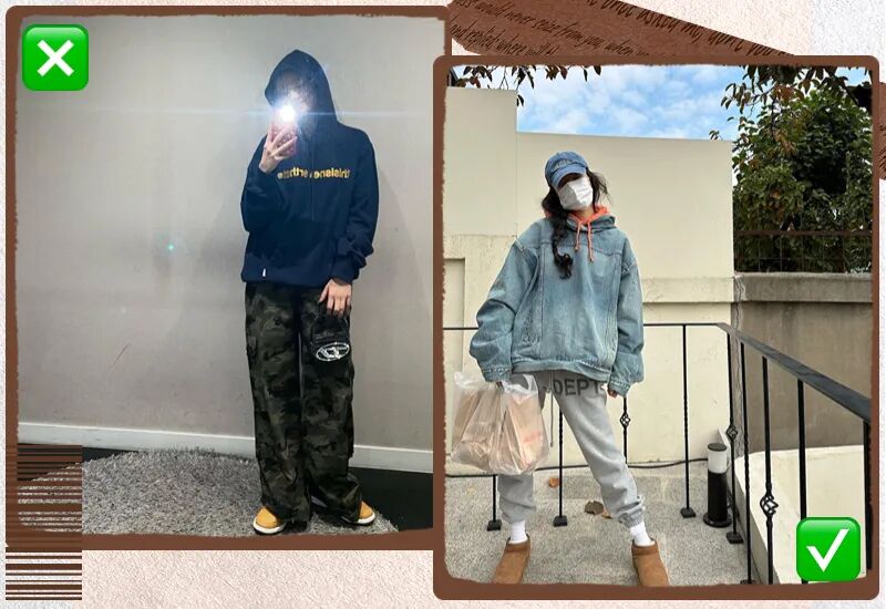 因为上身足够宽松,下身最好选择比较修身的裤子来平衡。如果上下都宽松,一米八也能穿成一米五。