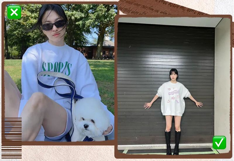如果是上身肉比较多的姐妹,也更推荐短卫衣,宽松卫衣太容易穿成球了,短卫衣分割出高腰线,看上去就会好很多~