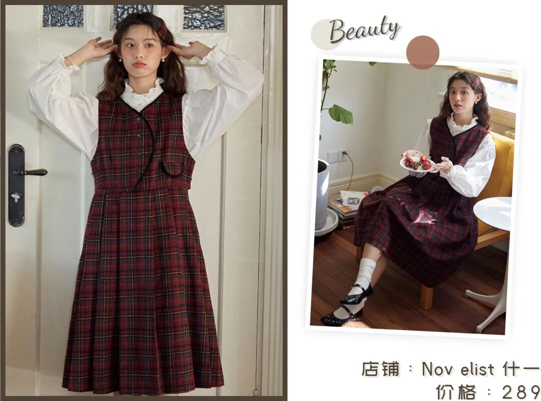 这件红色格纹背心裙就很nice,不对称的门襟设计感十足,A字型裙摆对身材的包容性很好,整套搭配复古又文艺~