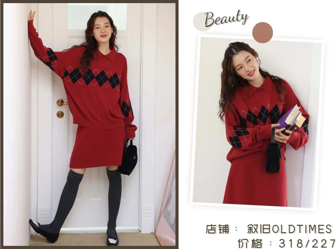 氛围感十足的红色套裙先安排上,上衣的菱格纹图案,复古又时髦,正红色显白不挑人,长辈看了都要夸,新年穿再合适不过了~