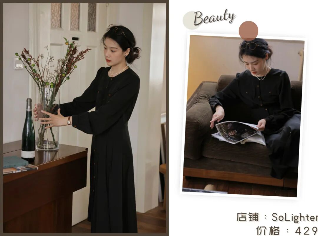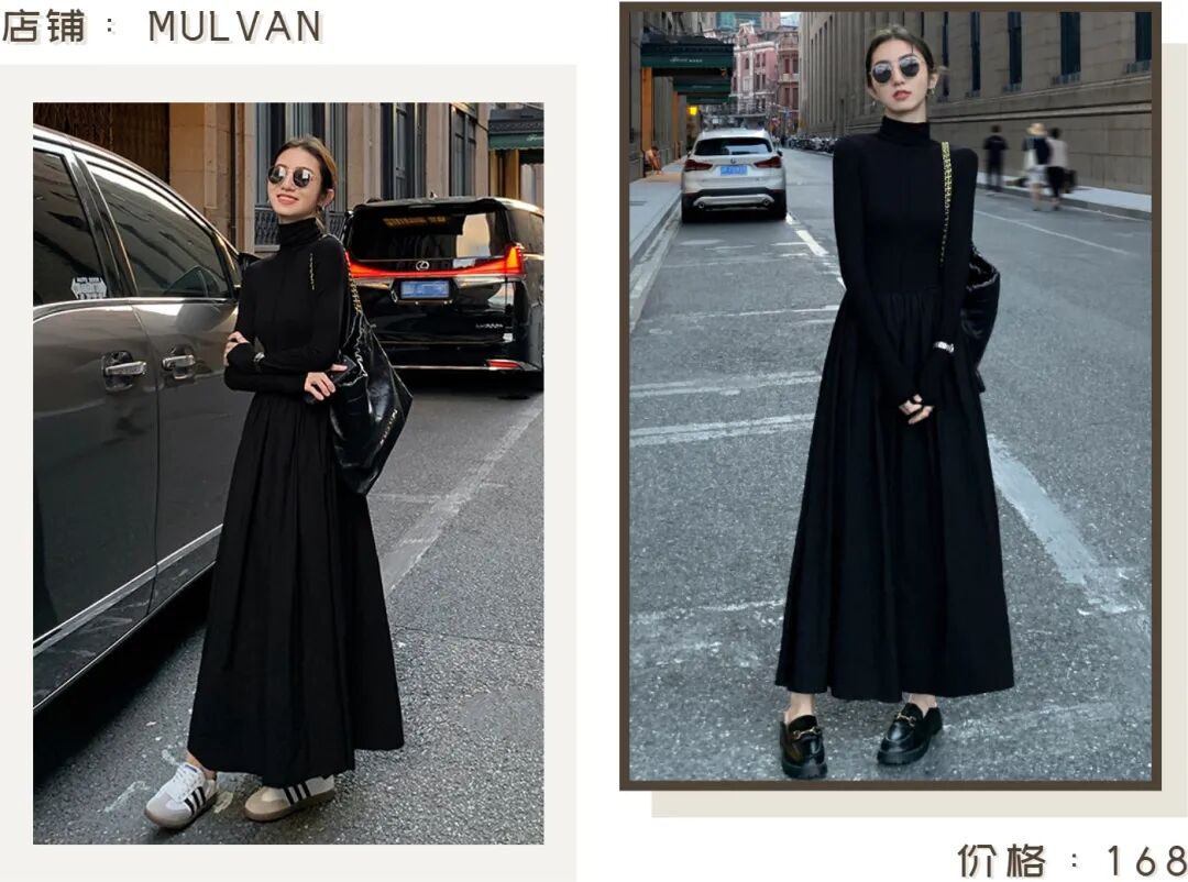 这种all black的高领连衣裙看起平平无奇,其实满满的小心机,腰间的收褶设计+小A字裙摆,可以把肚子上的肉都藏住,简直就是显瘦天花板,各种身材都能轻松驾驭!