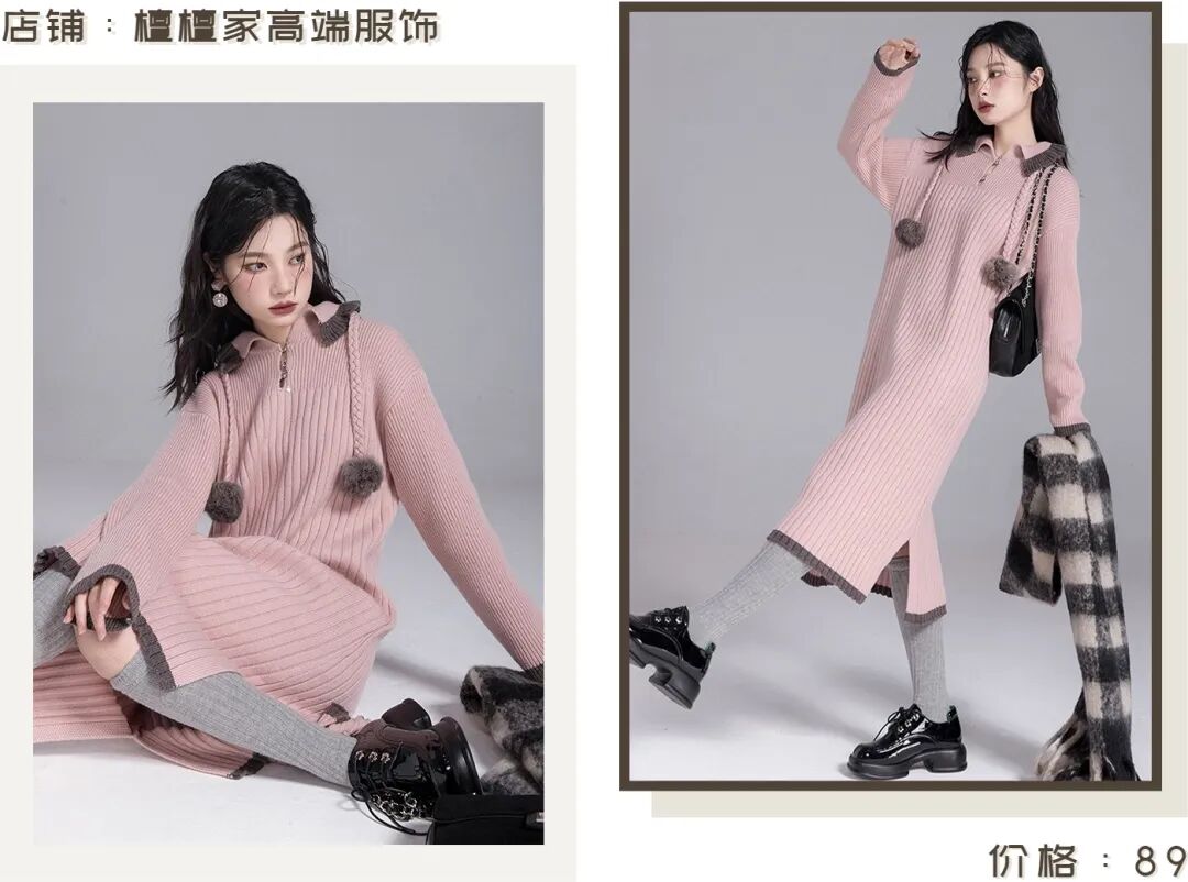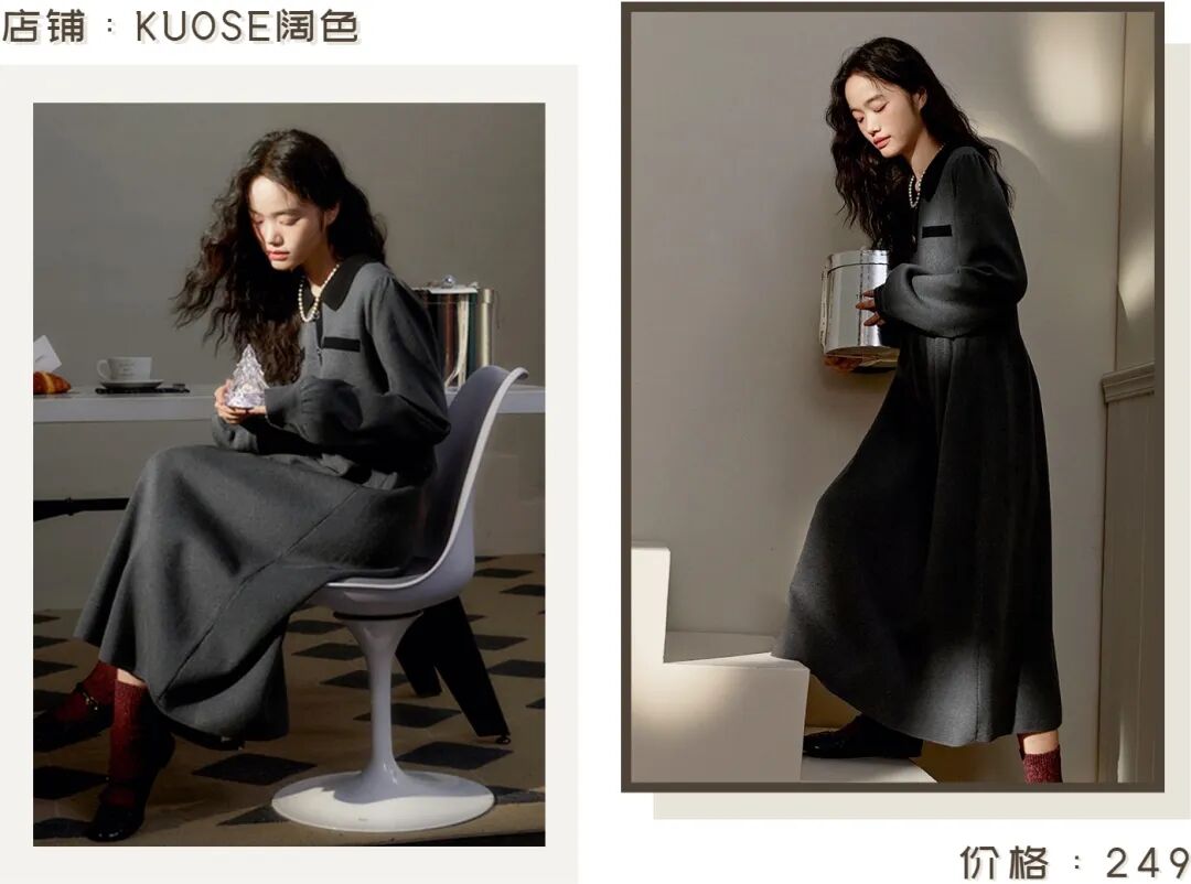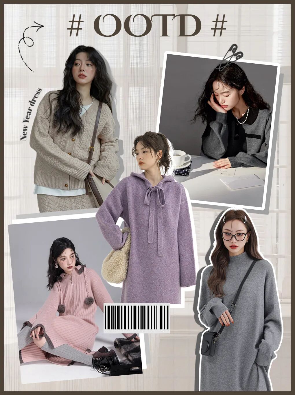 不喜欢高领的姐妹,可以选择一件翻领针织裙,小翻领设计可以很好的修饰脖子线条,胸前的毛球可爱又俏皮,慵懒的氛围感一整个拉满!