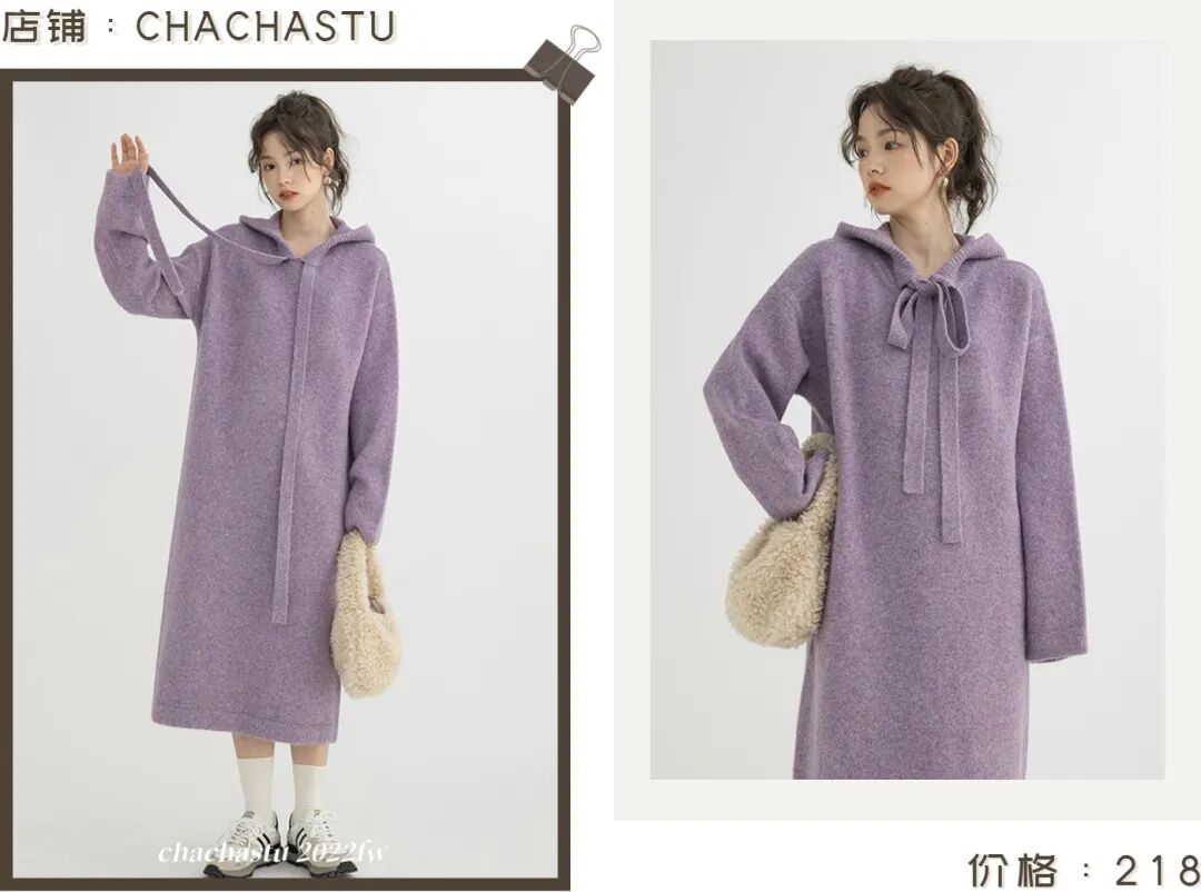 这件连帽针织裙我也很喜欢,低饱和度的香芋紫自带温柔滤镜,软软糯糯的,连帽的抽绳设计,休闲又减龄。