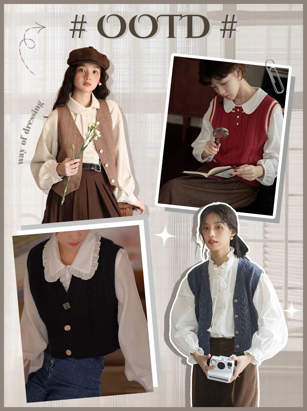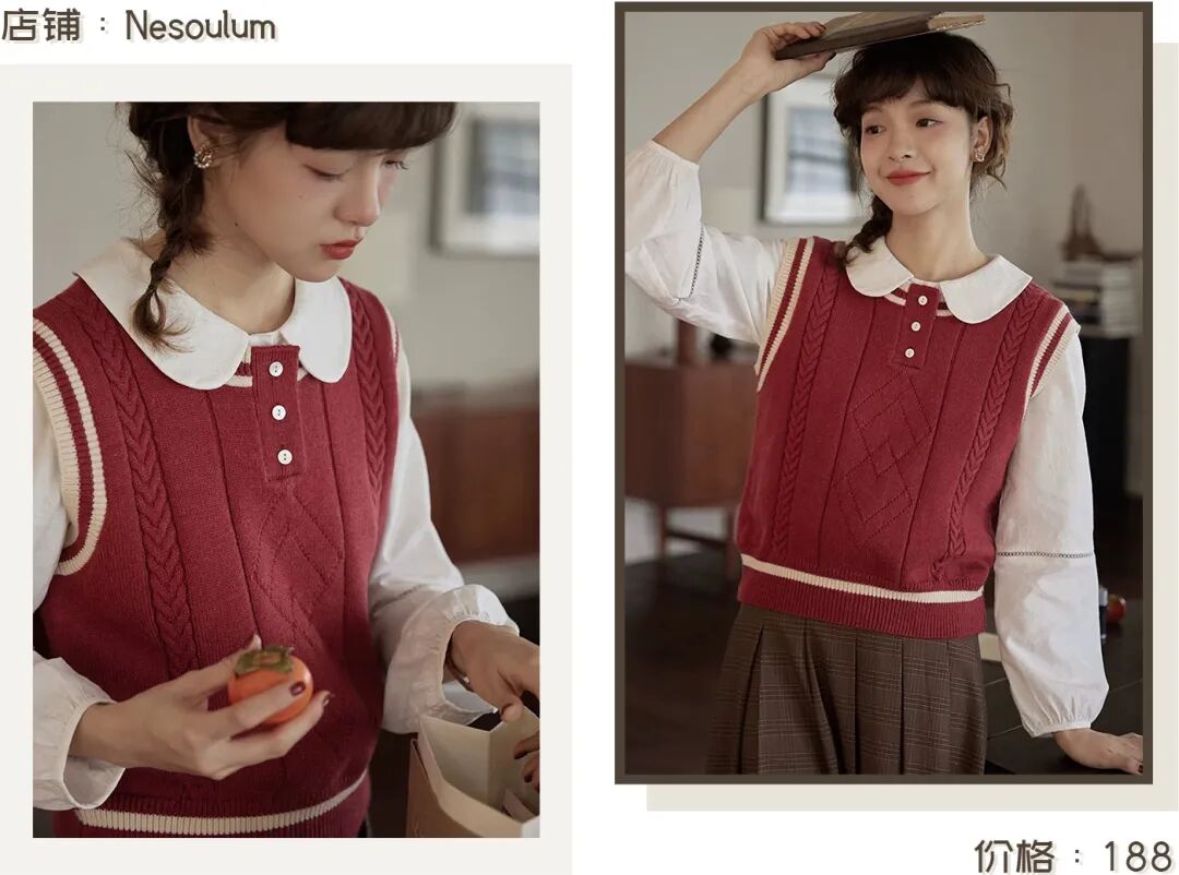 娃娃领白衬衫+枣红色针织马甲的组合好妙,完全就是真人化的樱桃小丸子呀,看起来乖巧又可爱~