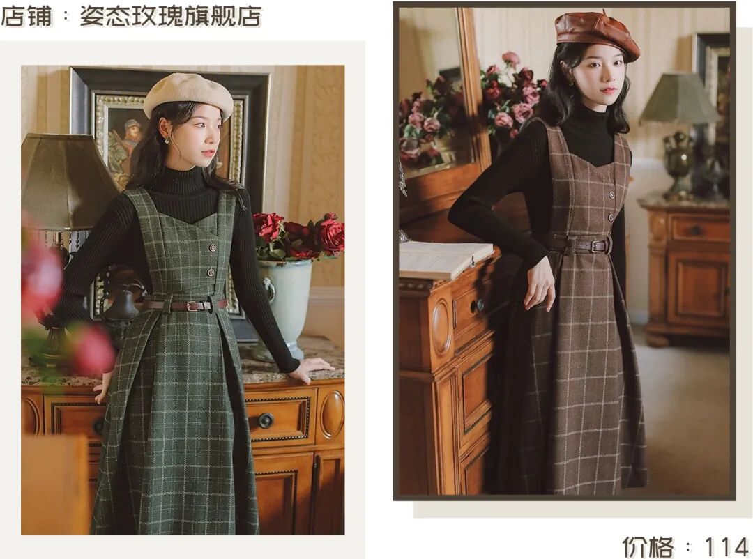 先选一件复古格纹背带裙吧,方领背心+复古纽扣的组合让人眼前一亮,收腰设计显瘦显身材,A字型裙摆对身材的包容性很好~