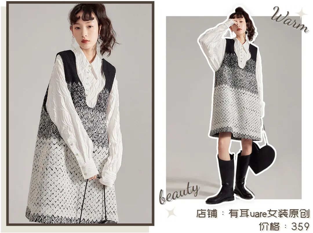 想要独特有个性,不妨看看这件毛呢背心裙,毛线提花肌理精致耐看,不规则的v领设计,在视觉上有效拉长了颈部线条,优雅又气质!