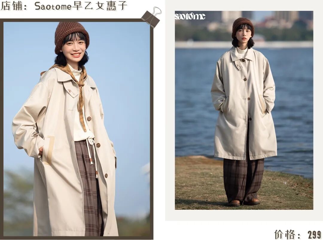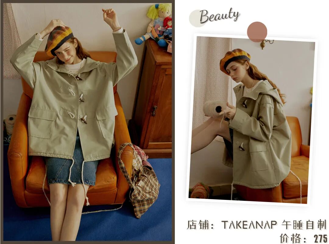 不想那么成熟,想要俏皮一点,可以考虑这件连帽风衣,风衣+深色牛角扣的搭配,低调又复古,满满的学院风。