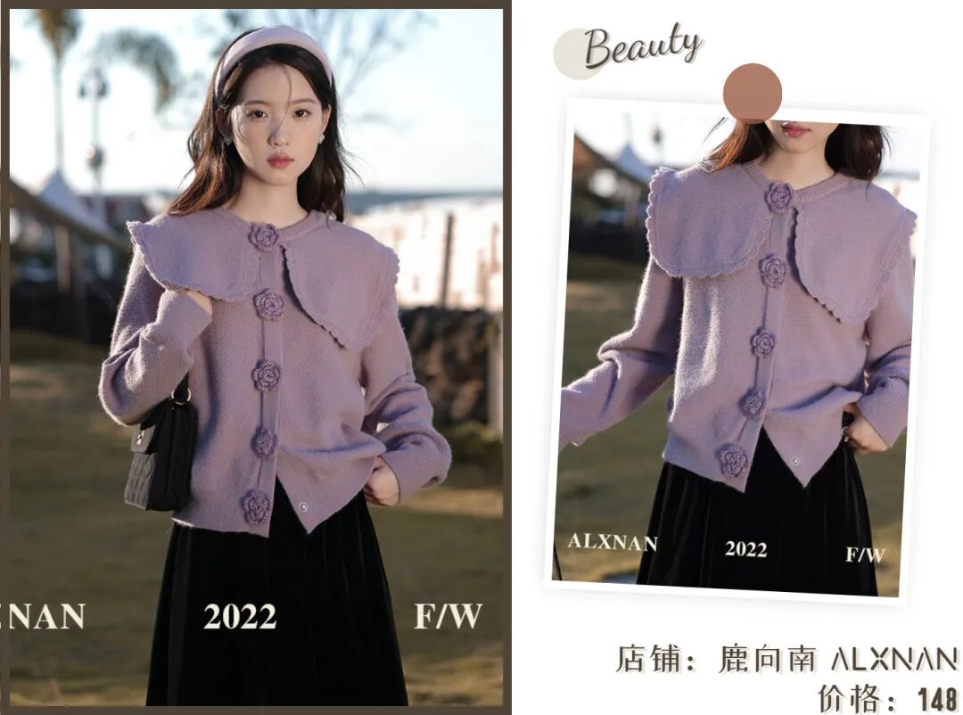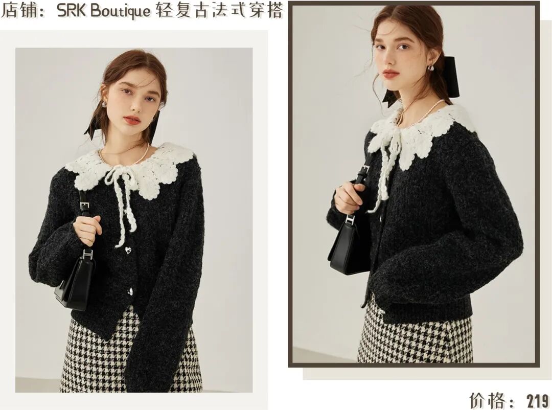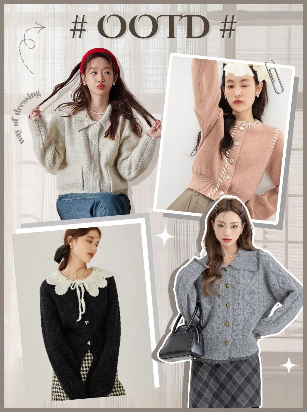 这件法式娃娃领针织衫也很漂亮!毛织纱线柔软又舒适,花瓣形状的领子好特别,门襟前的爱心纽扣满满的细节,巨耐看~