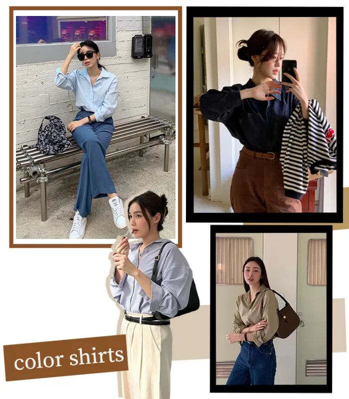 最简单的就是彩色衬衫+直筒裤的搭配,把衣角塞进裤子里分割比例,清爽又耐看!
