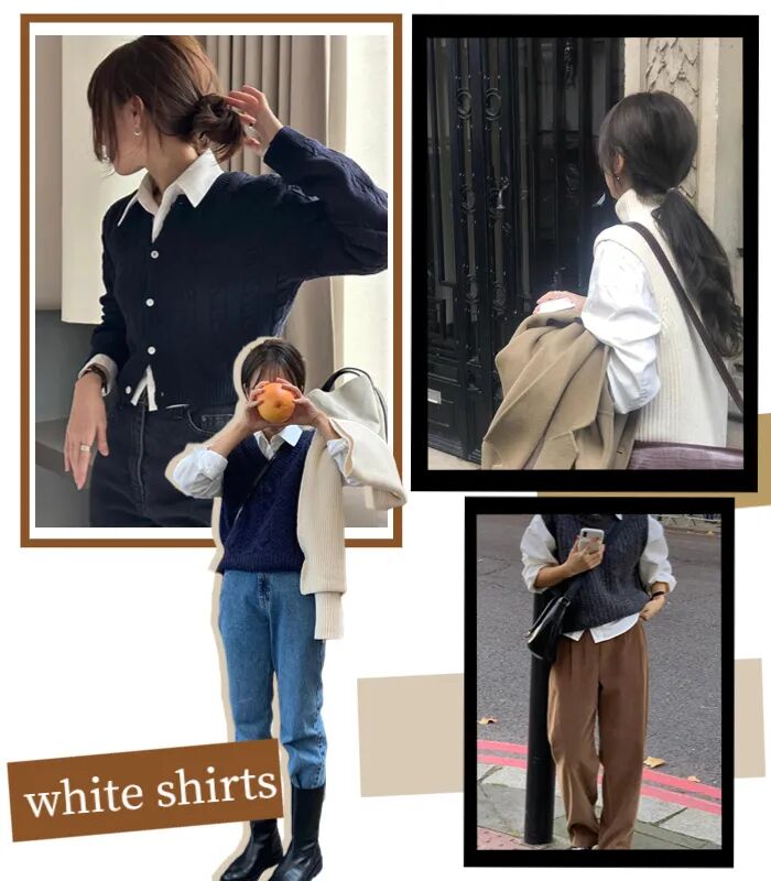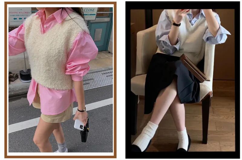 叠穿针织马甲or针织衫也是很流行的搭配方式,有种乖辣乖辣的感觉~